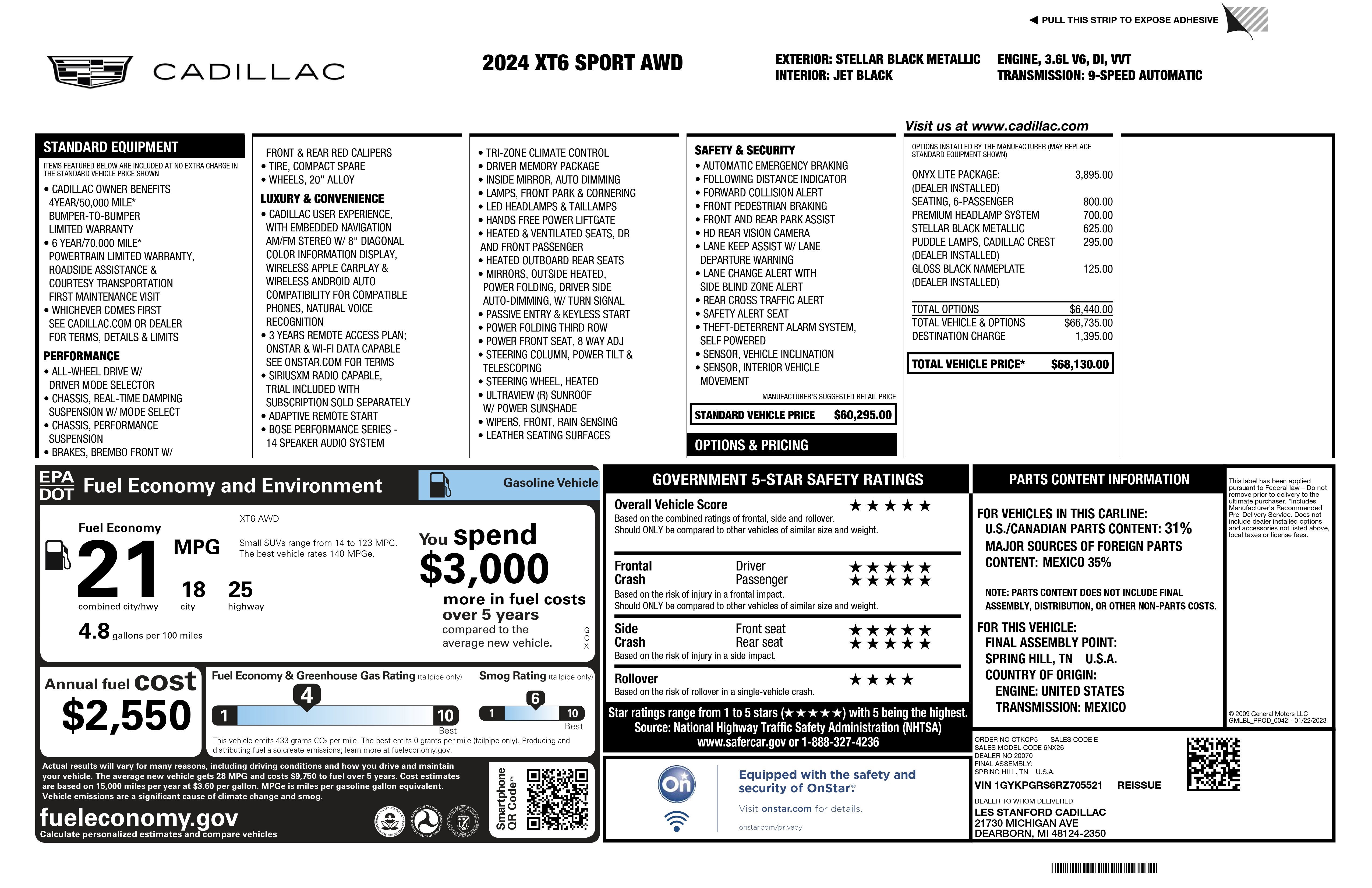 - LPO ONYX LITE PACKAGE includes (S2K) 20 Gloss Black wheels LPO (RWK) Gloss Black bodyside moldings LPO (RXX) Gloss Black rear license plate applique LPO (QJ5) Gloss Black front fascia applique LPO (VMP) Gloss Black exhaust bezel LPO (RIK) Gloss Black XT6 nameplate LPO and (SFZ) Monochrome Cadillac emblems LPO.